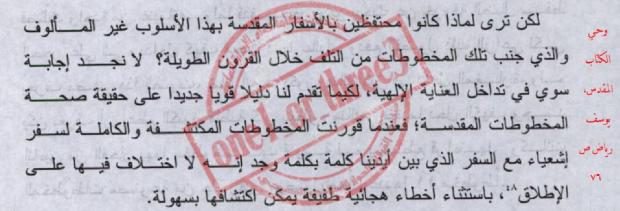 مخطوطات قمران تشهد على دقة العهد القديم، أسطورة لطالما رددها كثير من آباء النصارى وكتابهم؛ رددها كثيراً القمص بسيط في كتابه الكتاب المقدس يتحدى نقاده والقائلين بتحريفه وتحديداً في الفصل الخامس، رددها كثيراً القمص مرقص عزيز في كتابه استحالة تحريف الكتاب المقدس، رددها يوسف رياض في كتابه وحي الكتاب المقدس.