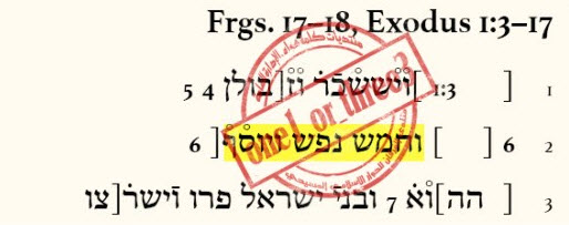 وهي ممزقة إلى 61 رقعة (قصاصة)، والذي يهمنا حالياً هو نص الرقعتين 17، 18، ففيهما أجزاء من خروج 1: 3-17.