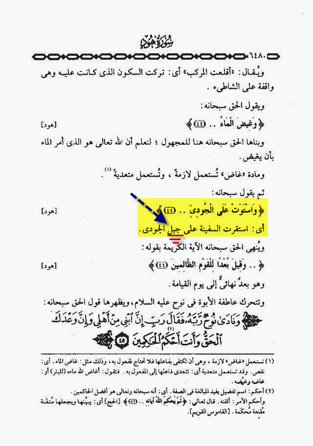 [ بالطبع لم يقل القرآن أن السفينة رست على المرتفعات ، و لكنها محاولة منهم لإخفاء الحقائق و تضليل الناس و ترجمة الأسماء بما لا يصح ]
