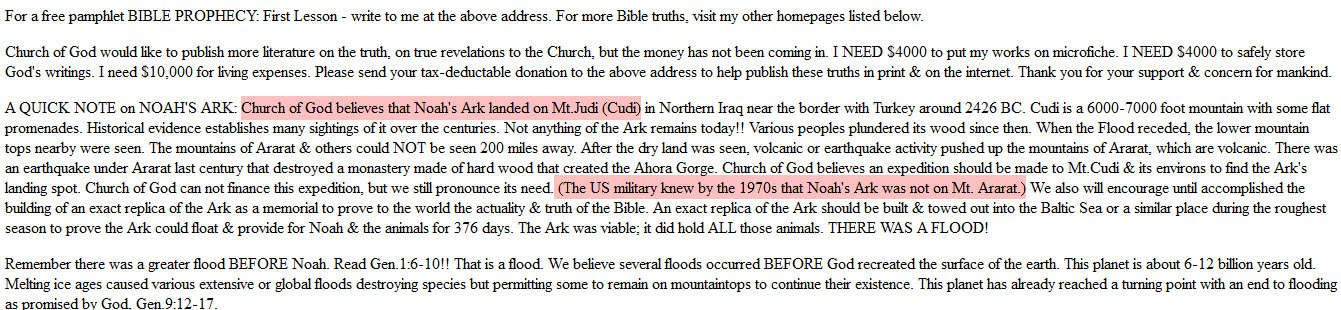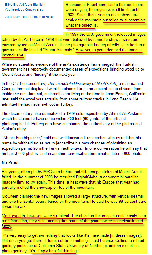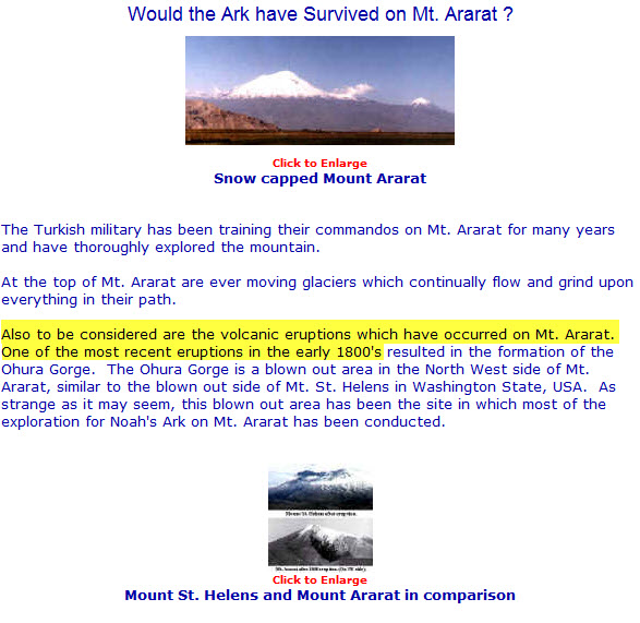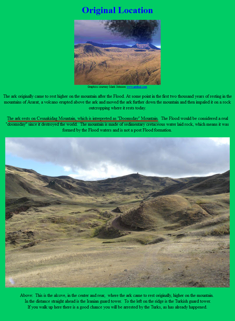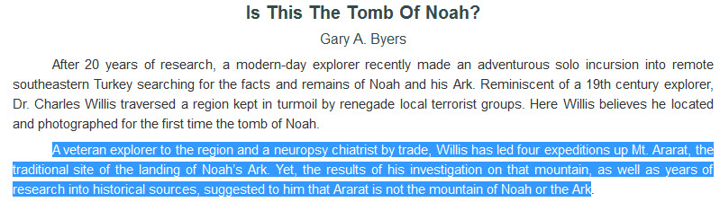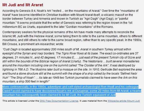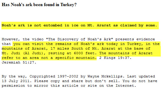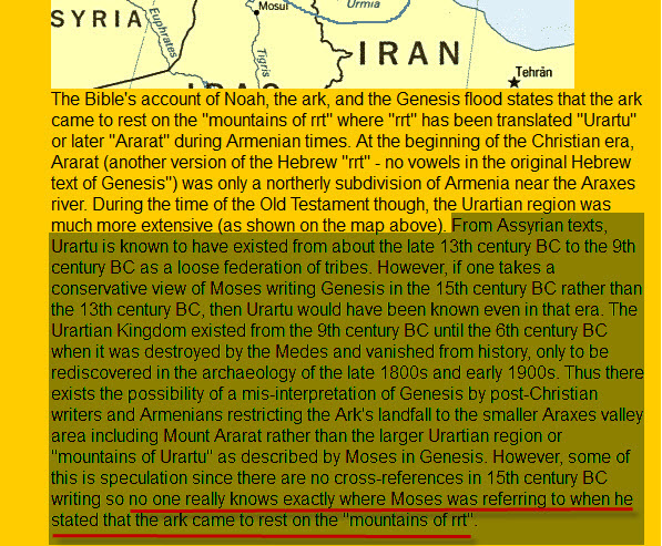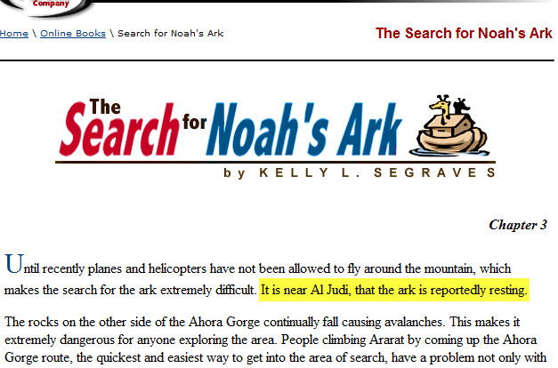 طبعاً هذا الموقع يتضح حتى من اسمه أنه يحاول إثبات صحة ما جاء في الكتاب المقدس بخصوص المكان الذي استوت عليه سفينة نوح فقال أن السفينة رست على قاعدة جبل الجودي الذي هو جبل من جبال أرارط ! ..... و قد اثبتنا في المشاركة السابقة أن جبل الجودي ليس من جبال أرارط :p012: .