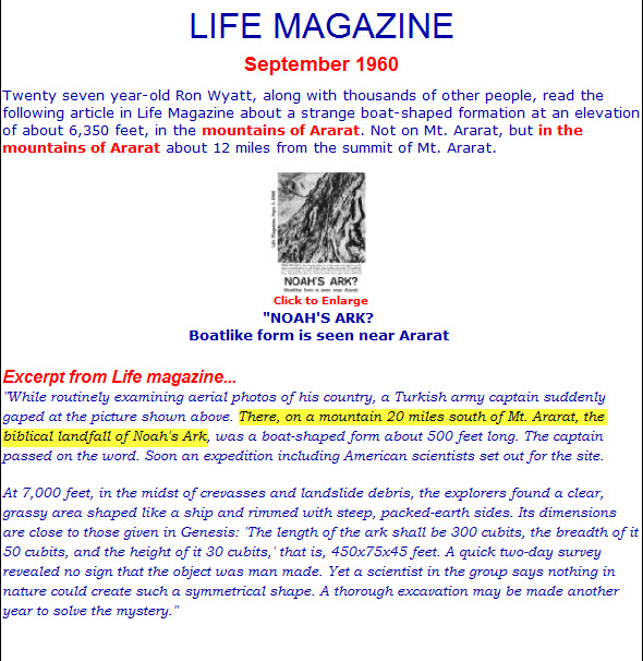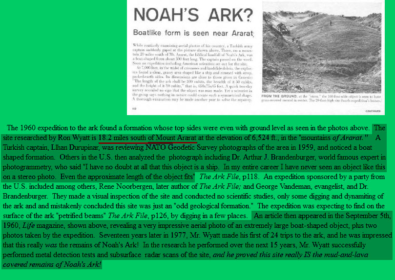 An article then appeared in the September 5th, 1960, Life magazine, shown above, revealing a very impressive aerial photo of an extremely large boat-shaped object, plus two photos taken by the expedition. Seventeen years later in 1977, Mr. Wyatt made his first of 24 trips to the ark, and he was impressed that this really was the remains of Noah's Ark! In the research he performed over the next 15 years, Mr. Wyatt successfully performed ************************l detection tests and subsurface radar scans of the site, and he proved this site really IS the mud-and-lava covered remains of Noah's Ark