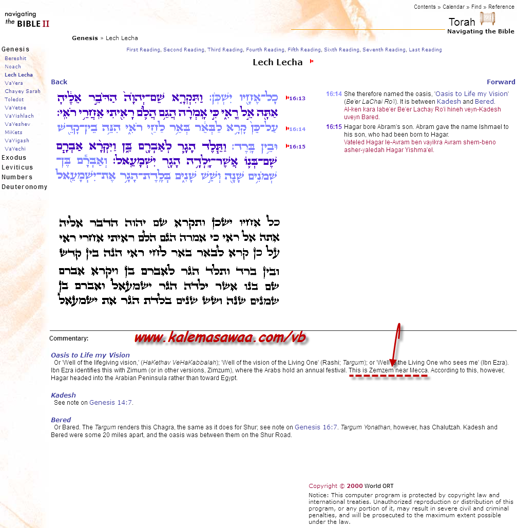 Or 'Well of the lifegiving vision,' (HaKethav VeHaKabbalah); 'Well of the vision of the Living One' (Rashi; Targum); or 'Well to the Living One who sees me' (Ibn Ezra). Ibn Ezra identifies this with Zimum (or in other versions, Zimzum), where the Arabs hold an annual festival. This is Zemzem near Mecca. According to this, however, Hagar headed into the Arabian Peninsula rather than toward Egypt.