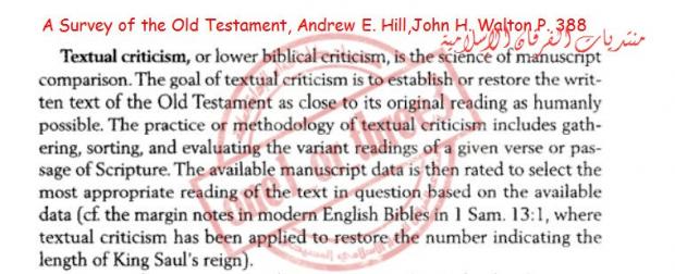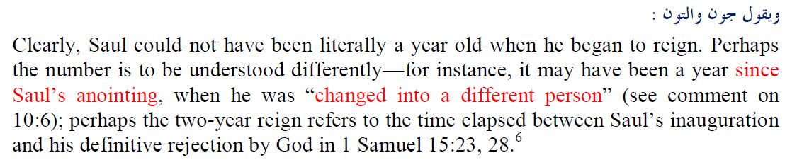 هاهو جون والتون نفسه تحت عنوان النقد النصي يختار نص صموئيل الأول13: 1، كمثال واضح جداً على النصوص التي بها مشاكل نصية!
