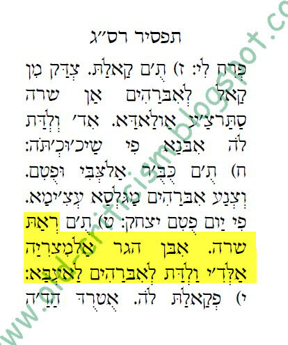 اي ما معناه ان ابراهيم " وضع الطفل على كتفها لان سارة القت عين شريرة عليه ( اسماعيل ) واصابته بالحمى ولم يستطيع المشي على قدميه ، فهنا نجد تفسير غريب بدليل اغرب فمن قال ان سارة اصلاً كانت حاضرة للموقف في الصباح؟ فالكتاب يذكر لنا ان ابراهيم هو من قام باكراً وم يذكر ان سارة قامت باكراً معه ولم يذكر انها حضرت هذه اللحظات ! فمن اين اتي بهذا الكلام ( كتابياً ) ؟ بالإضافة الى غرابة التدليل نفسه فهو يقول ان سارة القت عين على اسماعيل ! ، اي انها كانت تحقد عليه وتحسده وتسبب هذا في انه اصاب بالحمى ! ، من اين جاء بكل هذا ؟!