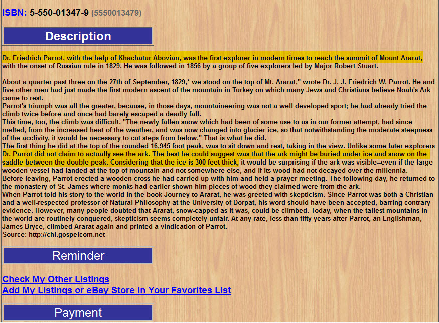 An article then appeared in the September 5th, 1960, Life magazine, shown above, revealing a very impressive aerial photo of an extremely large boat-shaped object, plus two photos taken by the expedition. Seventeen years later in 1977, Mr. Wyatt made his first of 24 trips to the ark, and he was impressed that this really was the remains of Noah's Ark! In the research he performed over the next 15 years, Mr. Wyatt successfully performed ************************l detection tests and subsurface radar scans of the site, and he proved this site really IS the mud-and-lava covered remains of Noah's Ark