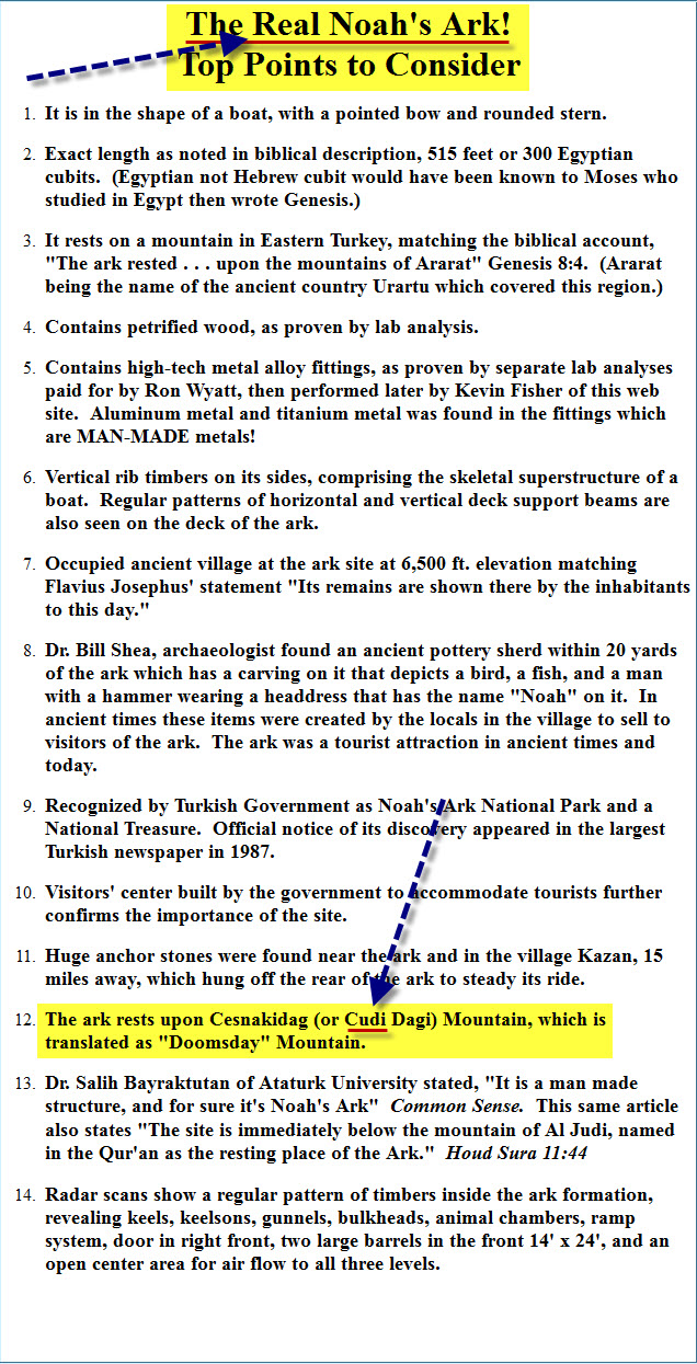 The ark rests upon Cesnakidag (or Cudi Dagi) Mountain, which is translated as "Doomsday" Mountain
