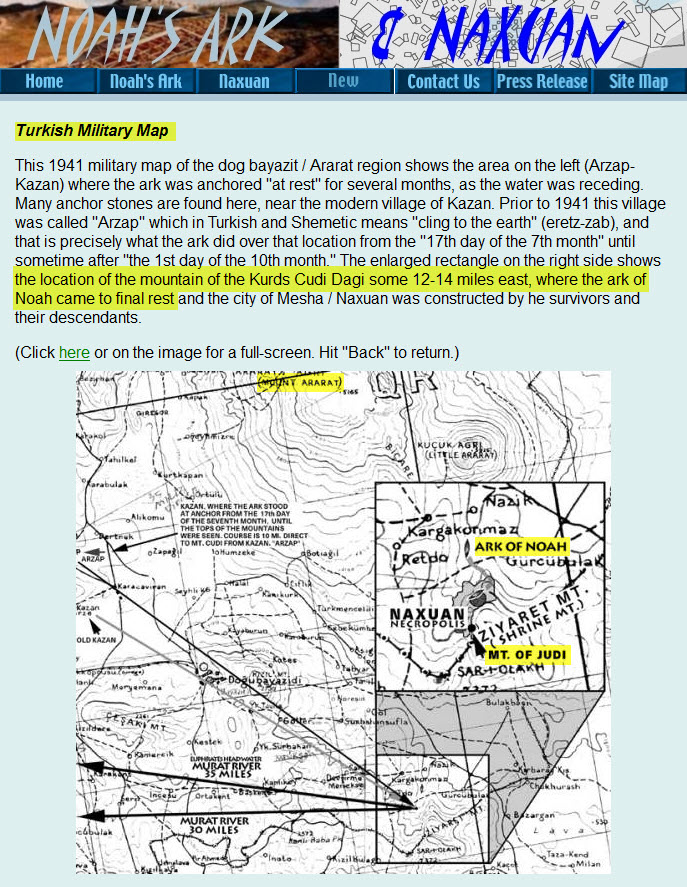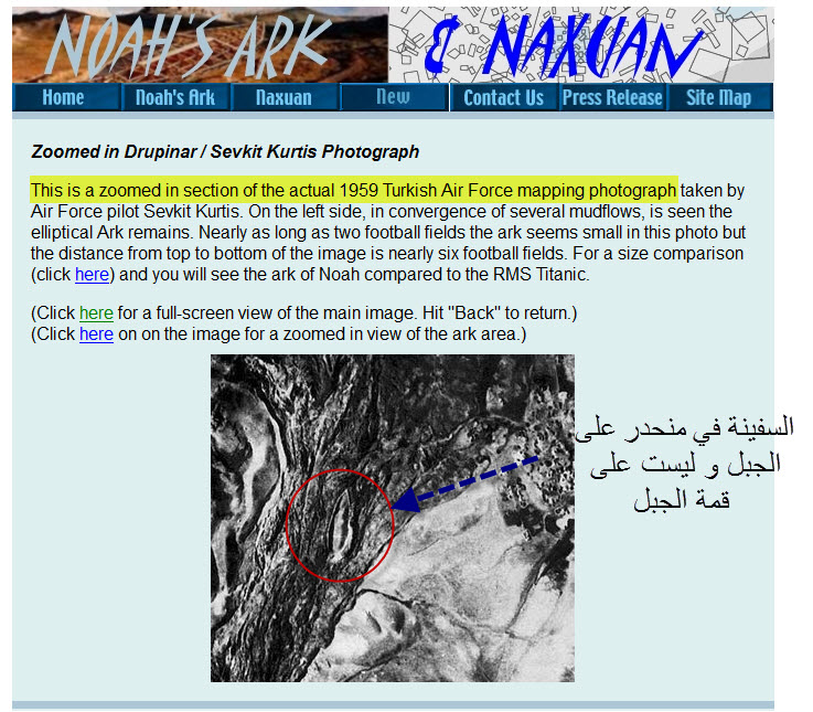 و كما قلت أن هذا أول و أكبر موقع يتحدث عن سفينة نوح حتي أنه يعمل مقارنات بين سفينة نوح و أقدم السفن التي كانت موجودة من قبل ابتداءاً من أول سفينة بناها الصين لنقل جنودهم و جيوشهم ، حتى أنه عمل مقارنة بين سفينة نوح و سفينة تيتانك ، و في حيادية تامة و لم يذكر القرآن مطلقاً ، لكنه في نفس الوقت عندما استدل بالكتاب المقدس كان يستدل من ناحية المقارنة هل هذا كان مطابق للكلام فعلاً أم لا ، ولا يجامل أحد ، و في الصفحة الرئيسية للموقع واضع صورة كبيرة ملتقطة بالأقمار الصناعية توضح المنطقة ككل كما نرى بالأعلي جبل أرارط و الثلج يغطي قمته و في الأسفل يشير بالسهم إلى جبل الجودي و يوضح أنه المكان الحقيقي الذي رست عليه سفينة نوح و يوضح أيضاً مدينة Naxuan التي كان يسكن فيها سيدنا نوح و التي اكتشفت إلى جوار السفينة