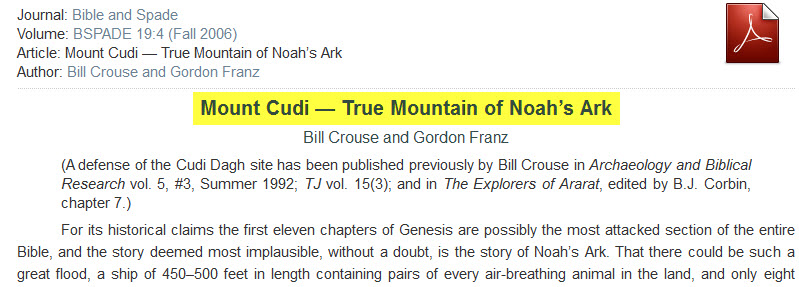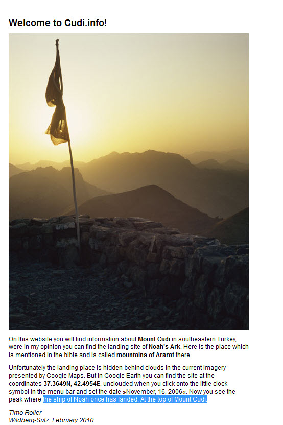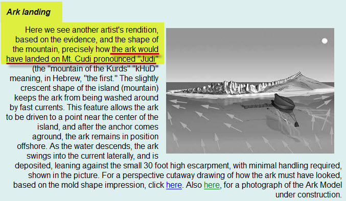 طبعاً هذا الموقع يتضح حتى من اسمه أنه يحاول إثبات صحة ما جاء في الكتاب المقدس بخصوص المكان الذي استوت عليه سفينة نوح فقال أن السفينة رست على قاعدة جبل الجودي الذي هو جبل من جبال أرارط ! ..... و قد اثبتنا في المشاركة السابقة أن جبل الجودي ليس من جبال أرارط :p012: .