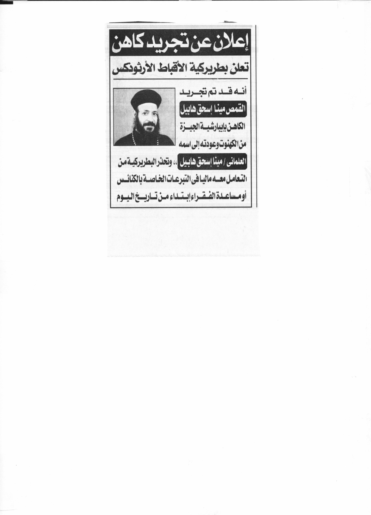 هو ده حاجة .. ان شاء الله حنشر لك قائمة باسماء المشلوحين ( المجردين من السلك الكهنوتى ) فى موضوع لعنة جماعة الامة القبطية ..وفضايح ومهازل واسباب تجريدهم وشلحهم .. الكنيسة فى حالة انشقاق وشروخ وفساد فاحت رائحته