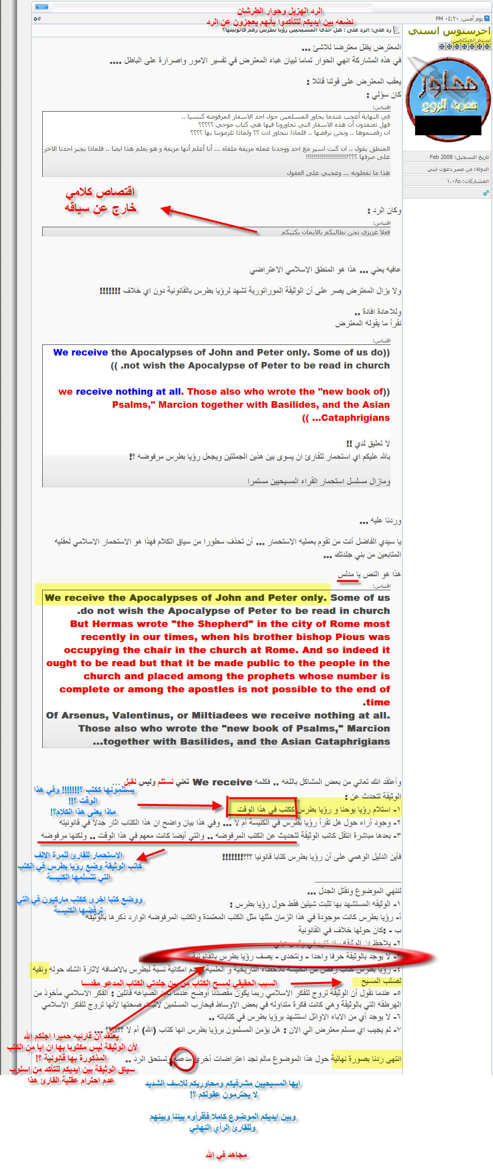 اتريد ان تسوى بين رؤيا يوحنا ورؤيا بطرس الذين وضعها في قائمة الكتب المقبولة التي تتسلمها الكنيسة في هذا الوقت وبين الكتب الهرطوقية التي قالت الكنيسة انها ترفضها ؟!!