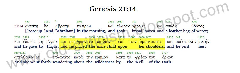 قلت : وهذا ما يبين ان هذا النصراني يسير بمبدأ " التحسيس " فهو يتعامل مع النص بمطنق العميان، فلم يتبقي له بعد فقد كل مقومات البحث العلمي الا ان يأخذ بالشبه وترتيب الكلمات وهو امر والله مضحك جداً." وبالرغم من هذا فإننا نجد ان ترتيب الكلمات في الترجمة السبعينية موافق في هذه الجزئية ( على كتفها والولد ) للنص العبري ، وبالطبع ترجمة الفانديك ولا اعرف لماذا ترجمتها من العالم برنتون على انها تقول " ووضع الولد على كتفها " .....