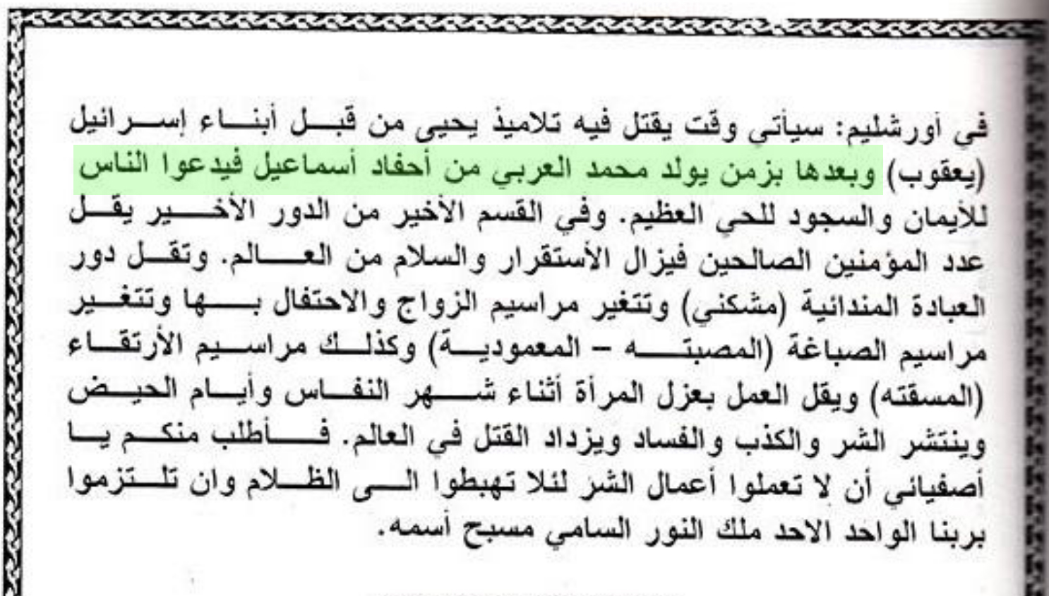 وبعدها بزمن يولد محمد العربي من أحفاد إسماعيل فيدعوا الناس للإيمان والسجود للحي العظيم