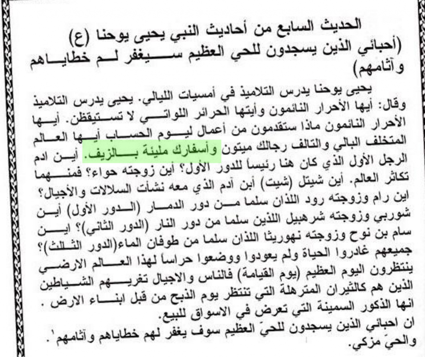 "نحلفك يحيى بالحي العظيم الذي تسجد له ثم يواصلون الى سؤالهم عن الآخرة بقولهم متى يغادر أبناء المؤمنين الصادقين (الى الأخرة)
